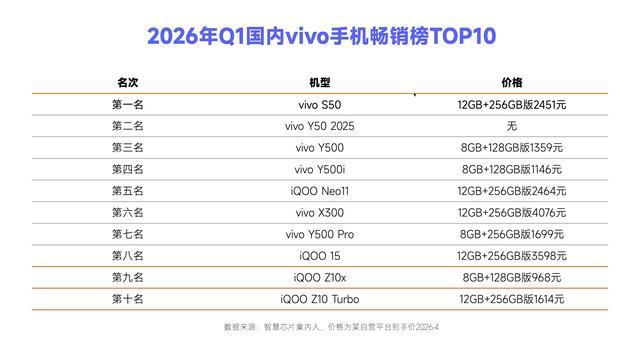 今天分享的是2026年Q1国内vivo手机畅销榜TOP10,因为蓝厂的价格调整时间是3月底,所以该榜单和涨价的关系不大。在本季度畅销榜中,仅有两款旗舰手机上榜,vivo和子品牌iQOO各占1款。剩下的8款以千元入门款机型为主,到手价超过2000元的仅有两款,它们分别为vivo S50和iQOO Neo11,以下是榜单的详细内容。